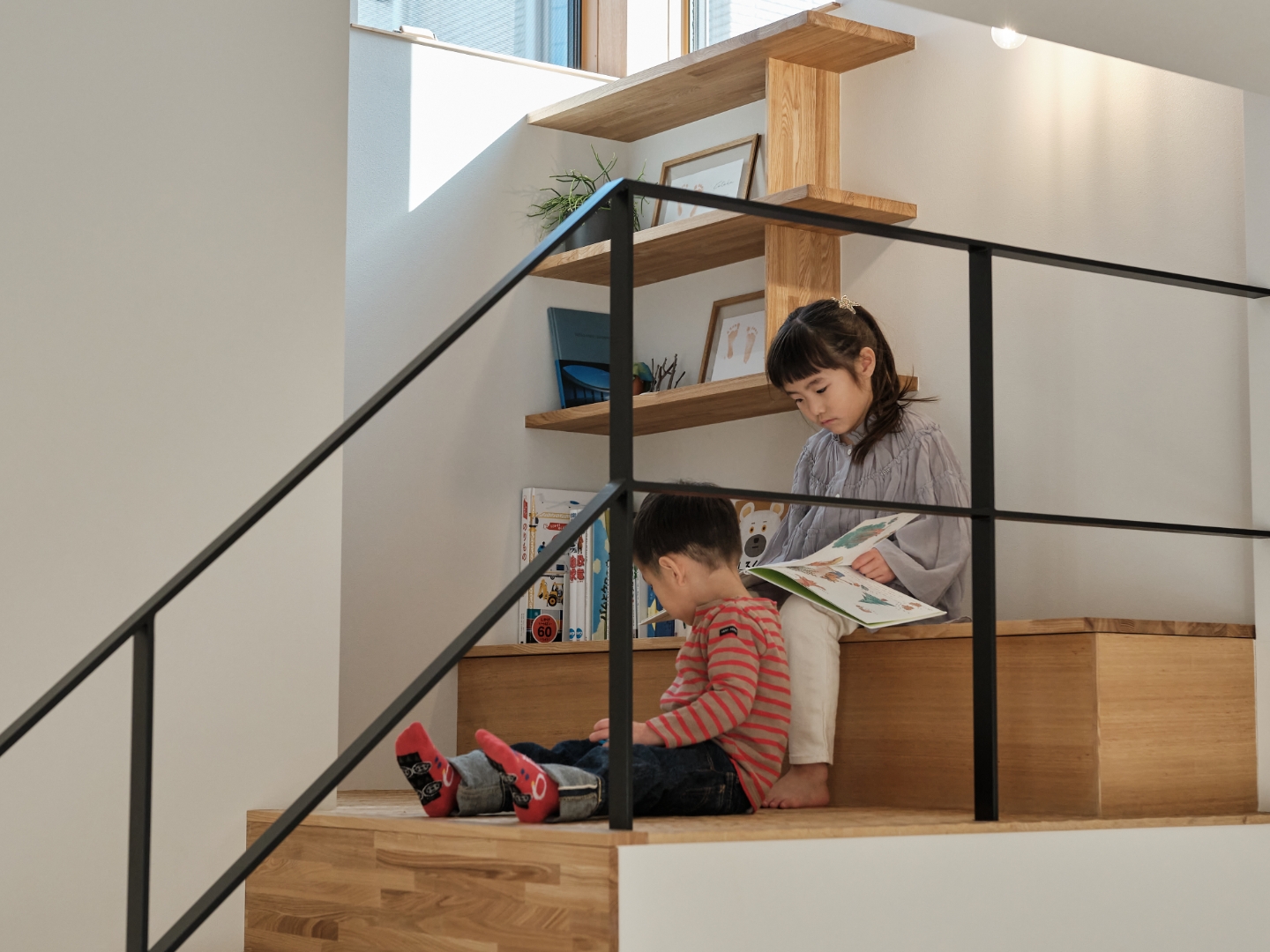 3階は、ホールに造作本棚を作り、まるで家の中に図書館があるような落ち着くスペースを設けました。この3階の吹き抜けからは2階のリビングを見下ろすことができるため、別々のフロアにいても家族の気配を身近に感じられます。