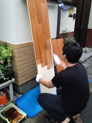 続いて、内装の色に合わせて塗装、塗装剤は以前にパインの床を塗った時の