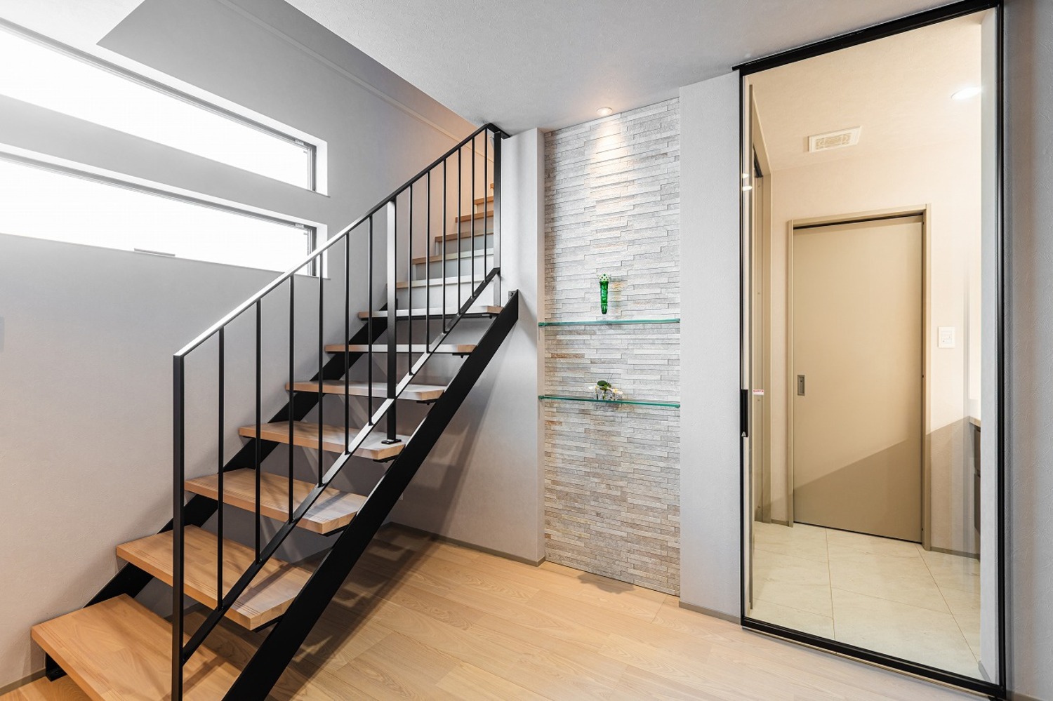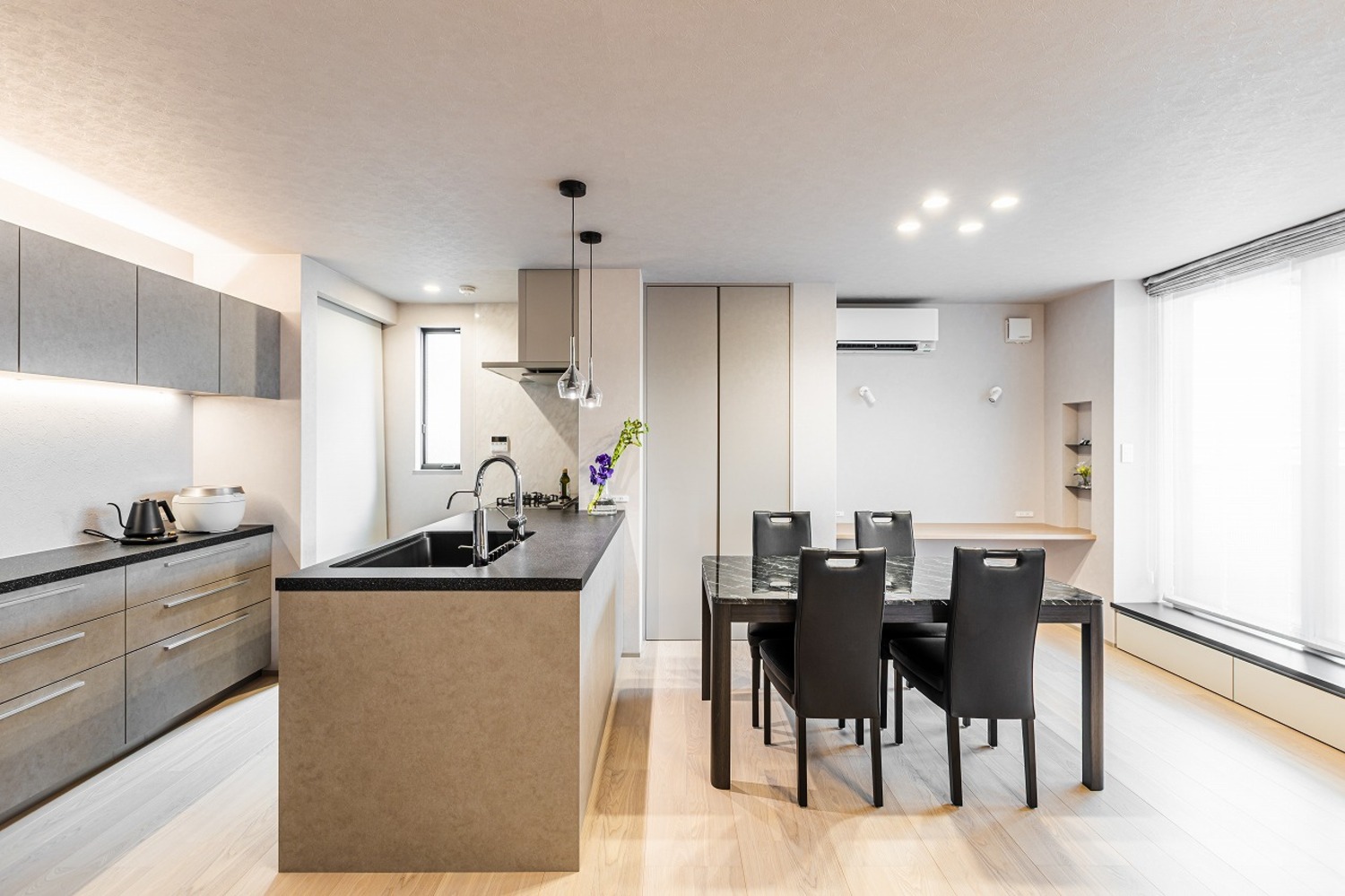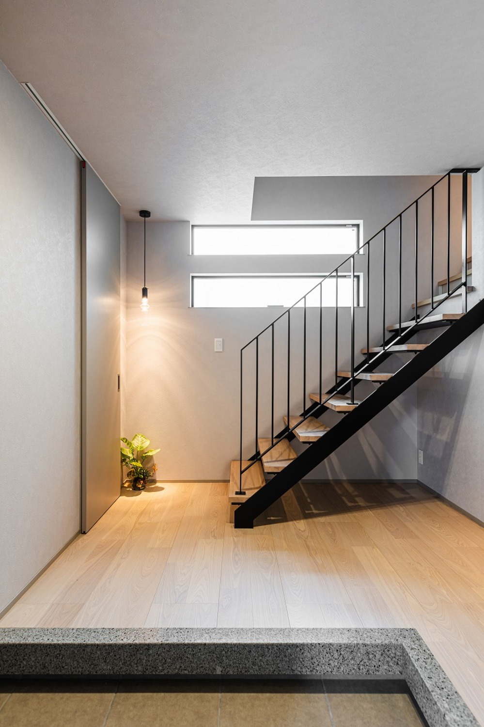 ホーム フォトギャラリー 注文住宅 すべて ワンフロアLDKで過ごす、やさしい光と素材に包まれた暮らし ワンフロアLDKで過ごす、やさしい光と素材に包まれた暮らし 上京区S様邸 注文住宅|すべて 水平ラインが美しい、端正な佇まい。奥行きのあるインナーバルコニーが、建物全体の水平ラインをより美しく見せています。軒天の木目と植栽の緑が映える、上質な仕上がりです。外構門扉と外壁には大谷石調のタイルを採用し、建物と美しく調和するアプローチに。玄関は通りから直接見えないように配置し、プライバシーに配慮しました。画像のみを表示全 9 枚中 1 枚目を表示Next ≫ 石目調の上がり框とアイアンの質感が、外観に採用した大谷石調タイルや随所に施された細部のデザインと美しく呼応する玄関ホール。内と外で素材のトーンを揃えることで、住まい全体が統一された印象になります。明るさを確保するために高窓とストリップ階段で、抜け感と自然な明るさを演出。グレイッシュなトーンでまとめ、デザイン性のあるペンダントライトが映えるシンプルな空間です。画像のみを表示全 9 枚中 2 枚目を表示≪ Prev|Next ≫ 階段横の床から天井まで伸びるニッチにはタイルをあしらい、ガラス棚を設けました。ディスプレイに光を落とし、上品な空間に仕上げます。1階に水まわりを集約することで生活動線が短縮され、日々の暮らしがスムーズに。玄関から洗面へと直接つながる動線により、帰宅してすぐに手洗いが可能です。画像のみを表示全 9 枚中 3 枚目を表示≪ Prev|Next ≫ 間接照明が陰影を生み、上質な雰囲気を纏う洗面空間。脱衣室とランドリースペースを独立させることで、来客時にも気兼ねなく使える機能的なレイアウトとしました。画像のみを表示全 9 枚中 4 枚目を表示≪ Prev|Next ≫ 2階はワンフロアすべてLDK。日常の動線に沿った、家族がゆったりと過ごせる開放的なフロア構成です。LDKは、モノトーンな空間が大理石やガラスの光沢を際立たせて、ラグジュアリーモダンに仕上げます。階段はアイアン手摺のひな壇階段とし、上部には吹き抜けを。LDKに光を落とし、開放的で明るい空間を生み出します。画像のみを表示全 9 枚中 5 枚目を表示≪ Prev|Next ≫ 階段はオープンな印象に。横格子を細かく設けたフラットバー手摺を採用し、お子さまの安全に配慮しています。壁側の手摺下には間接照明を仕込み、自然光のような柔らかな明かりで手元、足元をやさしく照らします。画像のみを表示全 9 枚中 6 枚目を表示≪ Prev|Next ≫ 窓辺にはヌック風のベンチを設けて、ちょっとしたくつろぎスペースを作りました。ベンチにはお子様の玩具入れに使える引き出し収納を備え、いつでもスッキリとした空間を保つことができます。画像のみを表示全 9 枚中 7 枚目を表示≪ Prev|Next ≫ キッチンはグレートーンで統一し、カップボードの上下には間接照明を設けました。ペンダントライトはクリアタイプを採用し、光の重なりが空間に軽やかさをプラス。リビング、ダイニングと一体感のある、洗練されたキッチンです。画像のみを表示全 9 枚中 8 枚目を表示≪ Prev|Next ≫ 落ち着きのあるホテルライクな仕様でまとめたトイレ。画像のみを表示全 9 枚中 9 枚目を表示≪ Prev 【建築DATA】 上京区(新築)建築概要/木造3階建て敷地面積/90.30㎡(27.31坪)延床面積/134.02㎡(40.54坪) 京都で注文住宅を建てるならデザオ建設におまかせください →施工事例がみられる!インスタグラムはこちら →イベント情報やお役立ち情報を配信☆Facebookはこちら →デザオ建設の家づくりがわかる資料はこちら 一覧へ戻る 注文住宅 集合住宅・公共施設など 店舗 ビル・マンション 施設 すべて 2階建て 3階建て 狭小住宅 SE構法(重量木骨の家) 二世帯住宅 店舗付き住宅 すべて マンション・集合住宅 公共施設 医療福祉施設 商業施設 すべて すべて すべて