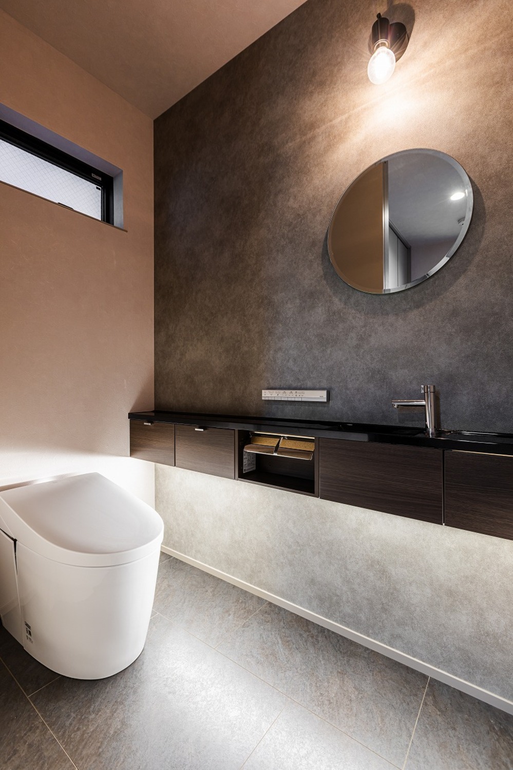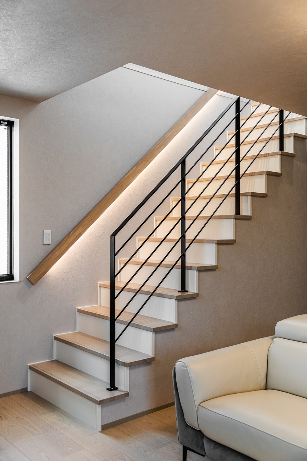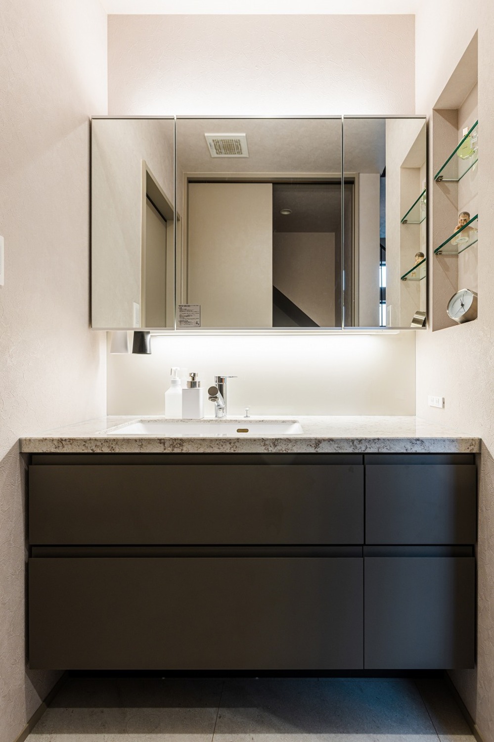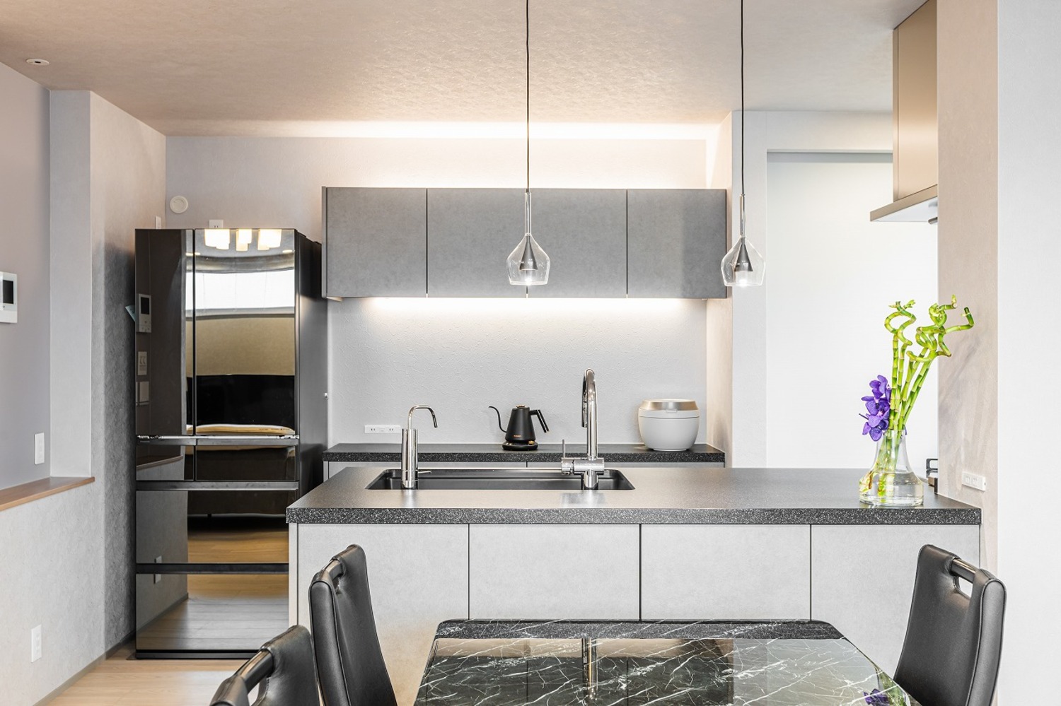 ホーム フォトギャラリー 注文住宅 すべて ワンフロアLDKで過ごす、やさしい光と素材に包まれた暮らし ワンフロアLDKで過ごす、やさしい光と素材に包まれた暮らし 上京区S様邸 注文住宅|すべて 水平ラインが美しい、端正な佇まい。奥行きのあるインナーバルコニーが、建物全体の水平ラインをより美しく見せています。軒天の木目と植栽の緑が映える、上質な仕上がりです。外構門扉と外壁には大谷石調のタイルを採用し、建物と美しく調和するアプローチに。玄関は通りから直接見えないように配置し、プライバシーに配慮しました。画像のみを表示全 9 枚中 1 枚目を表示Next ≫ 石目調の上がり框とアイアンの質感が、外観に採用した大谷石調タイルや随所に施された細部のデザインと美しく呼応する玄関ホール。内と外で素材のトーンを揃えることで、住まい全体が統一された印象になります。明るさを確保するために高窓とストリップ階段で、抜け感と自然な明るさを演出。グレイッシュなトーンでまとめ、デザイン性のあるペンダントライトが映えるシンプルな空間です。画像のみを表示全 9 枚中 2 枚目を表示≪ Prev|Next ≫ 階段横の床から天井まで伸びるニッチにはタイルをあしらい、ガラス棚を設けました。ディスプレイに光を落とし、上品な空間に仕上げます。1階に水まわりを集約することで生活動線が短縮され、日々の暮らしがスムーズに。玄関から洗面へと直接つながる動線により、帰宅してすぐに手洗いが可能です。画像のみを表示全 9 枚中 3 枚目を表示≪ Prev|Next ≫ 間接照明が陰影を生み、上質な雰囲気を纏う洗面空間。脱衣室とランドリースペースを独立させることで、来客時にも気兼ねなく使える機能的なレイアウトとしました。画像のみを表示全 9 枚中 4 枚目を表示≪ Prev|Next ≫ 2階はワンフロアすべてLDK。日常の動線に沿った、家族がゆったりと過ごせる開放的なフロア構成です。LDKは、モノトーンな空間が大理石やガラスの光沢を際立たせて、ラグジュアリーモダンに仕上げます。階段はアイアン手摺のひな壇階段とし、上部には吹き抜けを。LDKに光を落とし、開放的で明るい空間を生み出します。画像のみを表示全 9 枚中 5 枚目を表示≪ Prev|Next ≫ 階段はオープンな印象に。横格子を細かく設けたフラットバー手摺を採用し、お子さまの安全に配慮しています。壁側の手摺下には間接照明を仕込み、自然光のような柔らかな明かりで手元、足元をやさしく照らします。画像のみを表示全 9 枚中 6 枚目を表示≪ Prev|Next ≫ 窓辺にはヌック風のベンチを設けて、ちょっとしたくつろぎスペースを作りました。ベンチにはお子様の玩具入れに使える引き出し収納を備え、いつでもスッキリとした空間を保つことができます。画像のみを表示全 9 枚中 7 枚目を表示≪ Prev|Next ≫ キッチンはグレートーンで統一し、カップボードの上下には間接照明を設けました。ペンダントライトはクリアタイプを採用し、光の重なりが空間に軽やかさをプラス。リビング、ダイニングと一体感のある、洗練されたキッチンです。画像のみを表示全 9 枚中 8 枚目を表示≪ Prev|Next ≫ 落ち着きのあるホテルライクな仕様でまとめたトイレ。画像のみを表示全 9 枚中 9 枚目を表示≪ Prev 【建築DATA】 上京区(新築)建築概要/木造3階建て敷地面積/90.30㎡(27.31坪)延床面積/134.02㎡(40.54坪) 京都で注文住宅を建てるならデザオ建設におまかせください →施工事例がみられる!インスタグラムはこちら →イベント情報やお役立ち情報を配信☆Facebookはこちら →デザオ建設の家づくりがわかる資料はこちら 一覧へ戻る 注文住宅 集合住宅・公共施設など 店舗 ビル・マンション 施設 すべて 2階建て 3階建て 狭小住宅 SE構法(重量木骨の家) 二世帯住宅 店舗付き住宅 すべて マンション・集合住宅 公共施設 医療福祉施設 商業施設 すべて すべて すべて