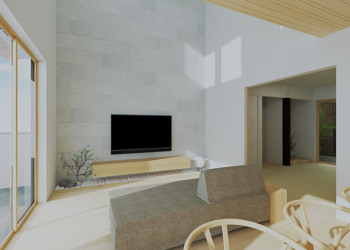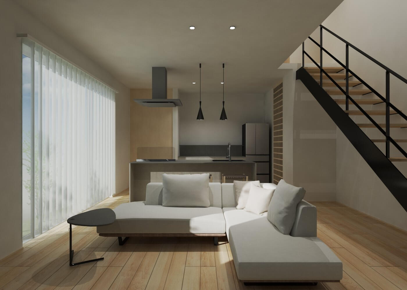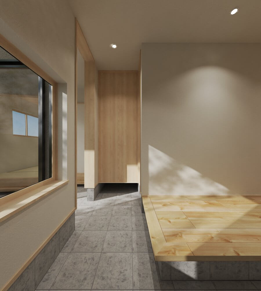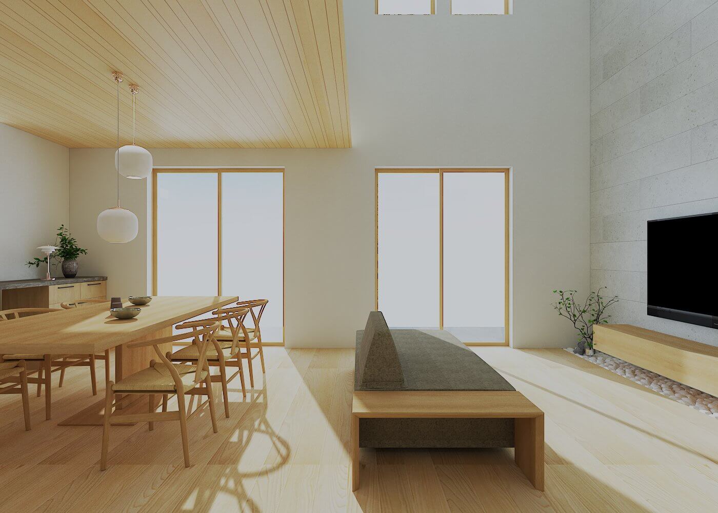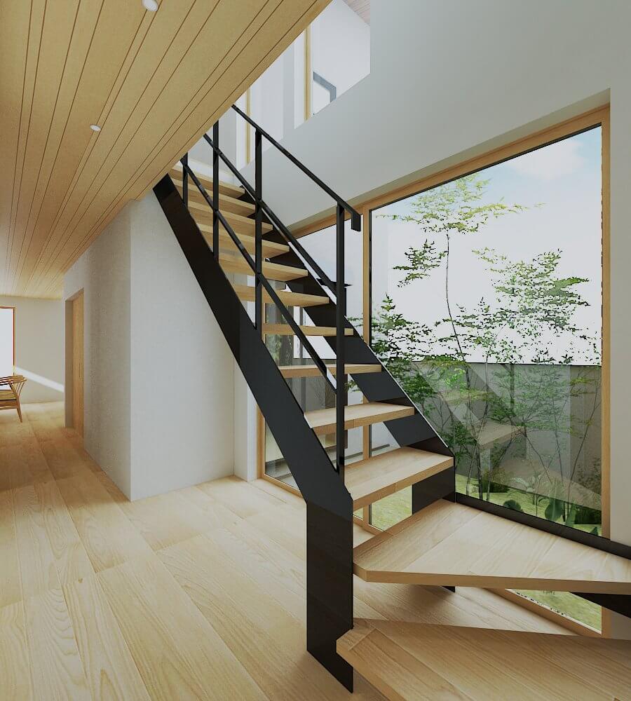 生活の中心となる2階のリビングは、天井を大きな吹き抜けにすることで圧倒的な開放感を生み出しており、南側に設けた大きな窓からは明るい光がたっぷりと差し込みます。