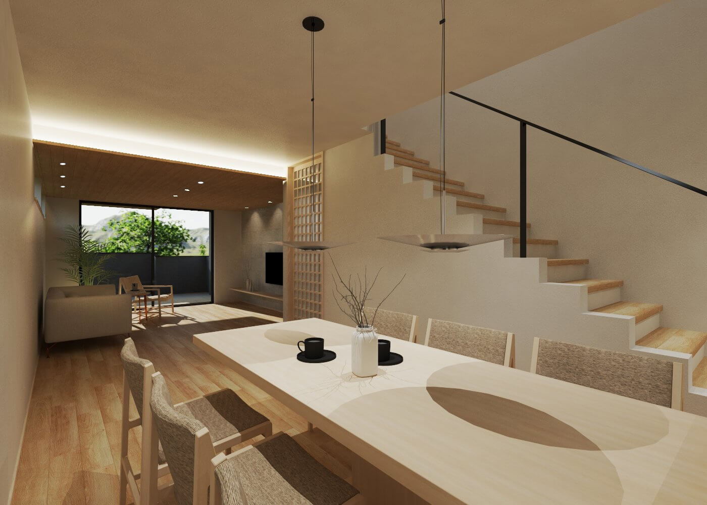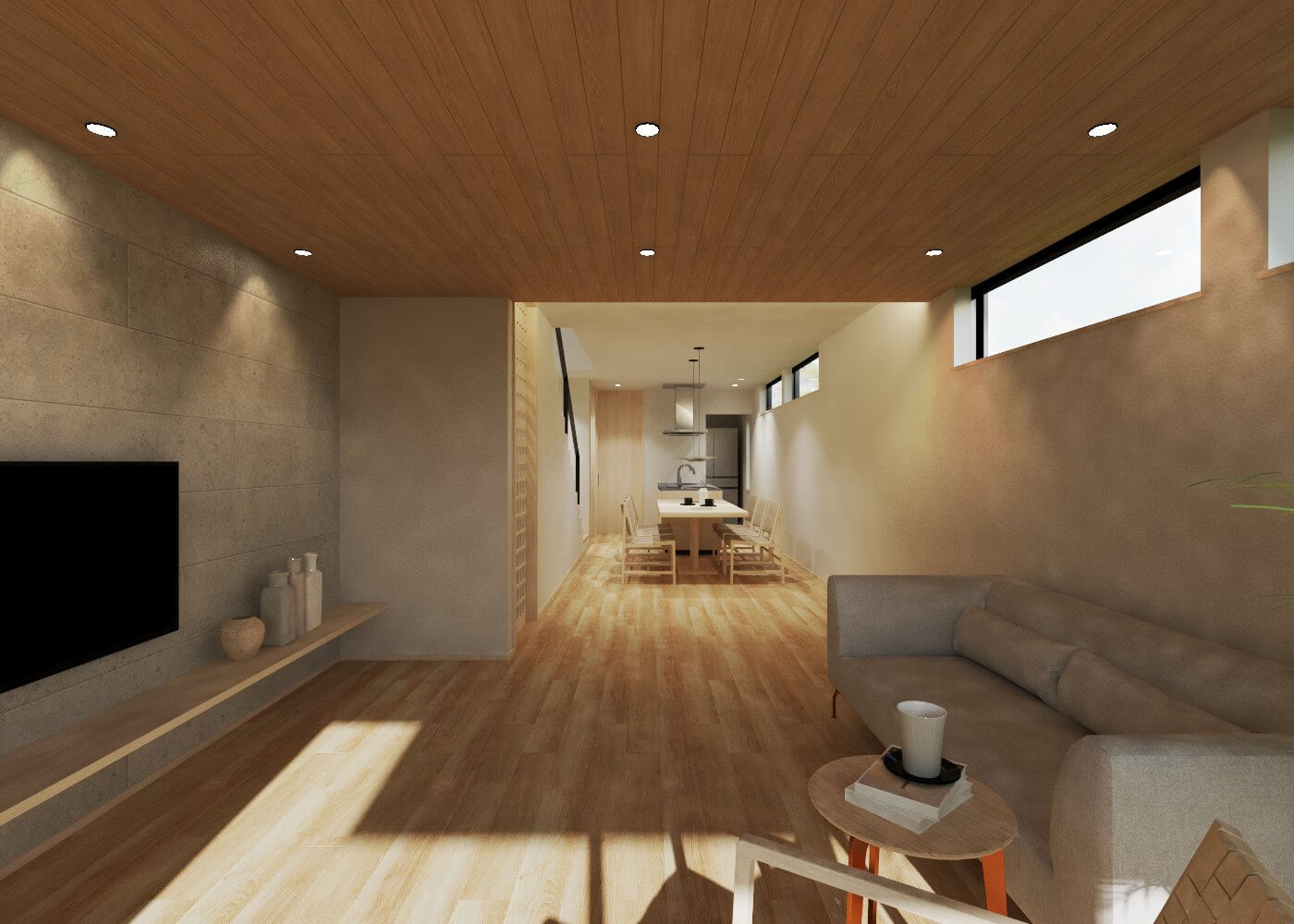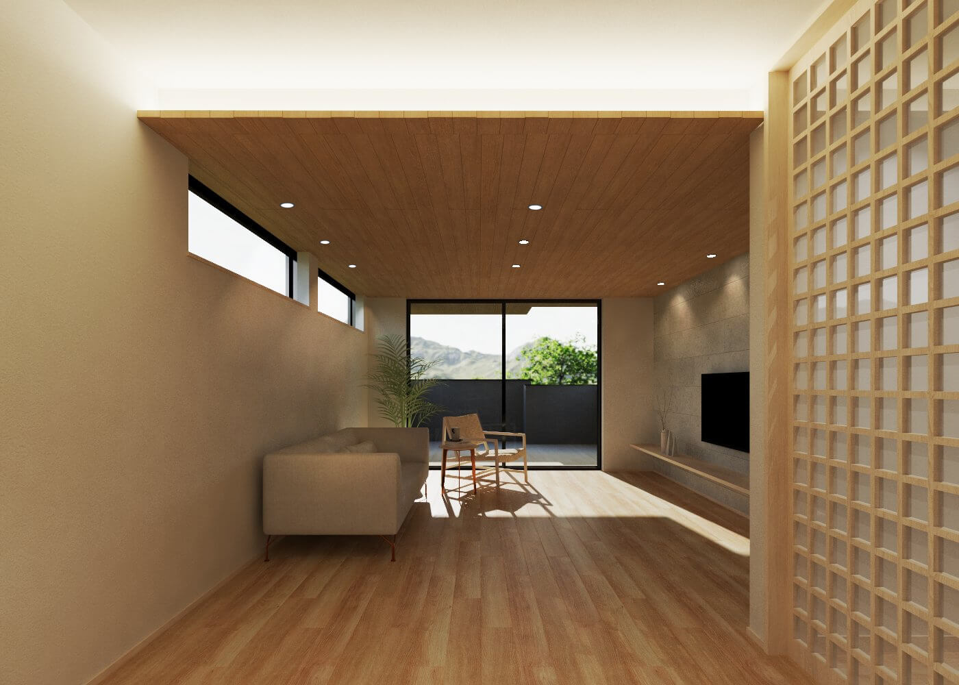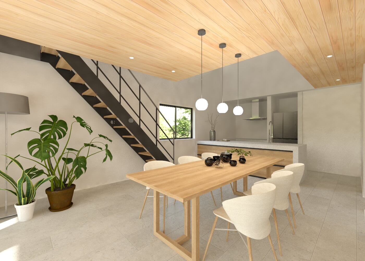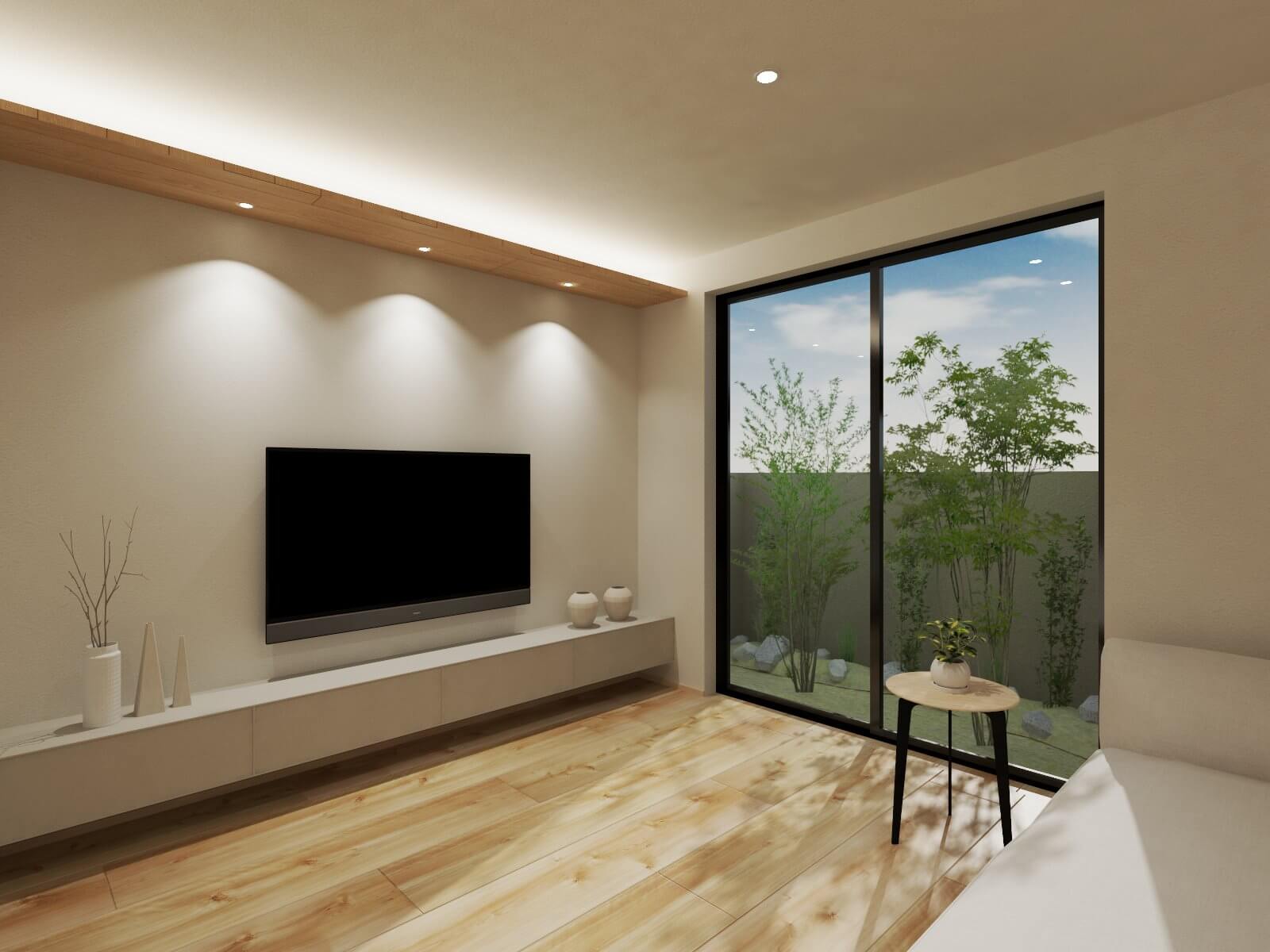 生活の中心となる2階のリビングは、天井を大きな吹き抜けにすることで圧倒的な開放感を生み出しており、南側に設けた大きな窓からは明るい光がたっぷりと差し込みます。