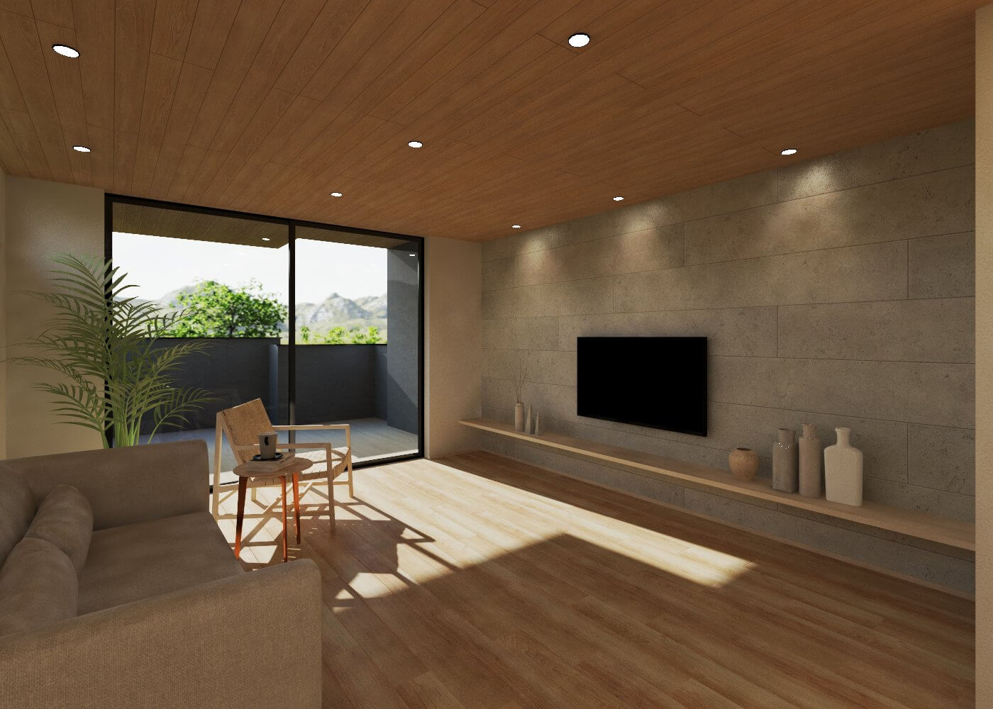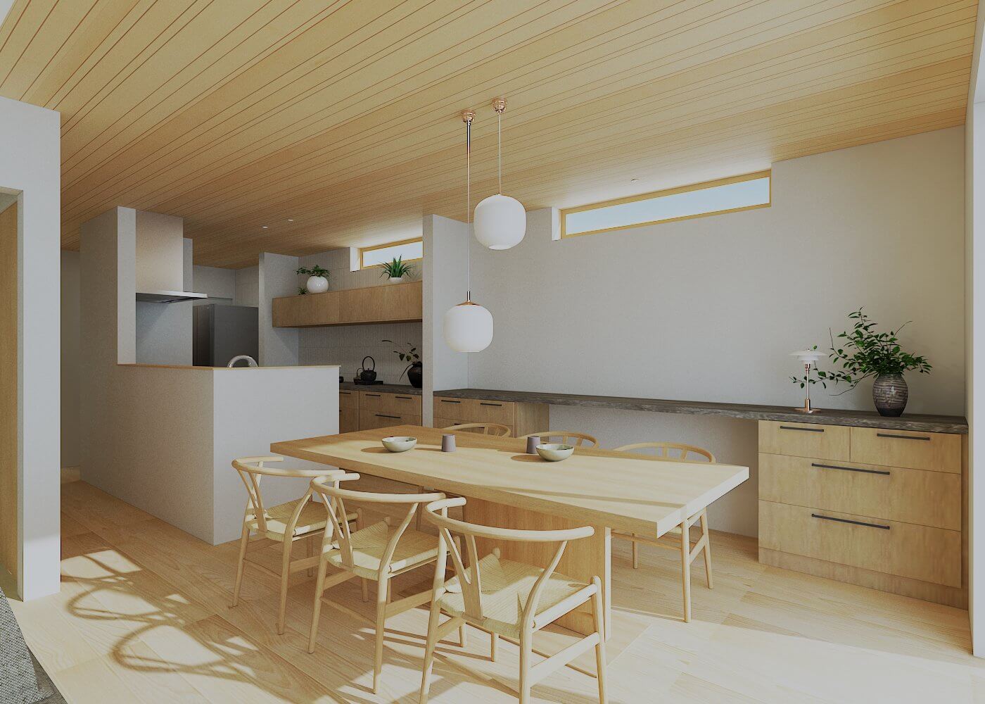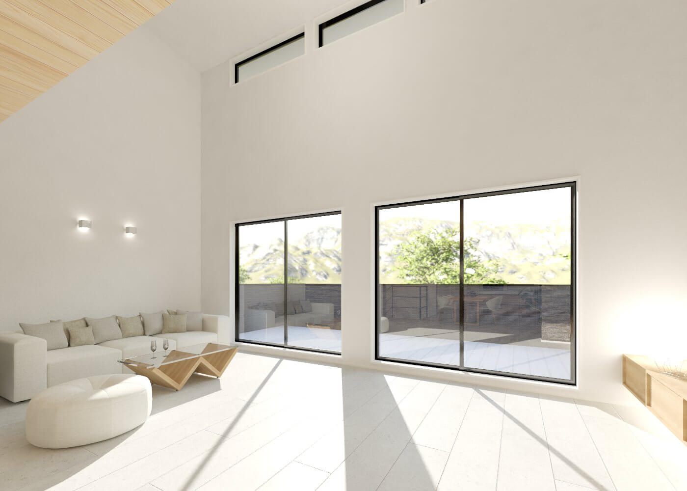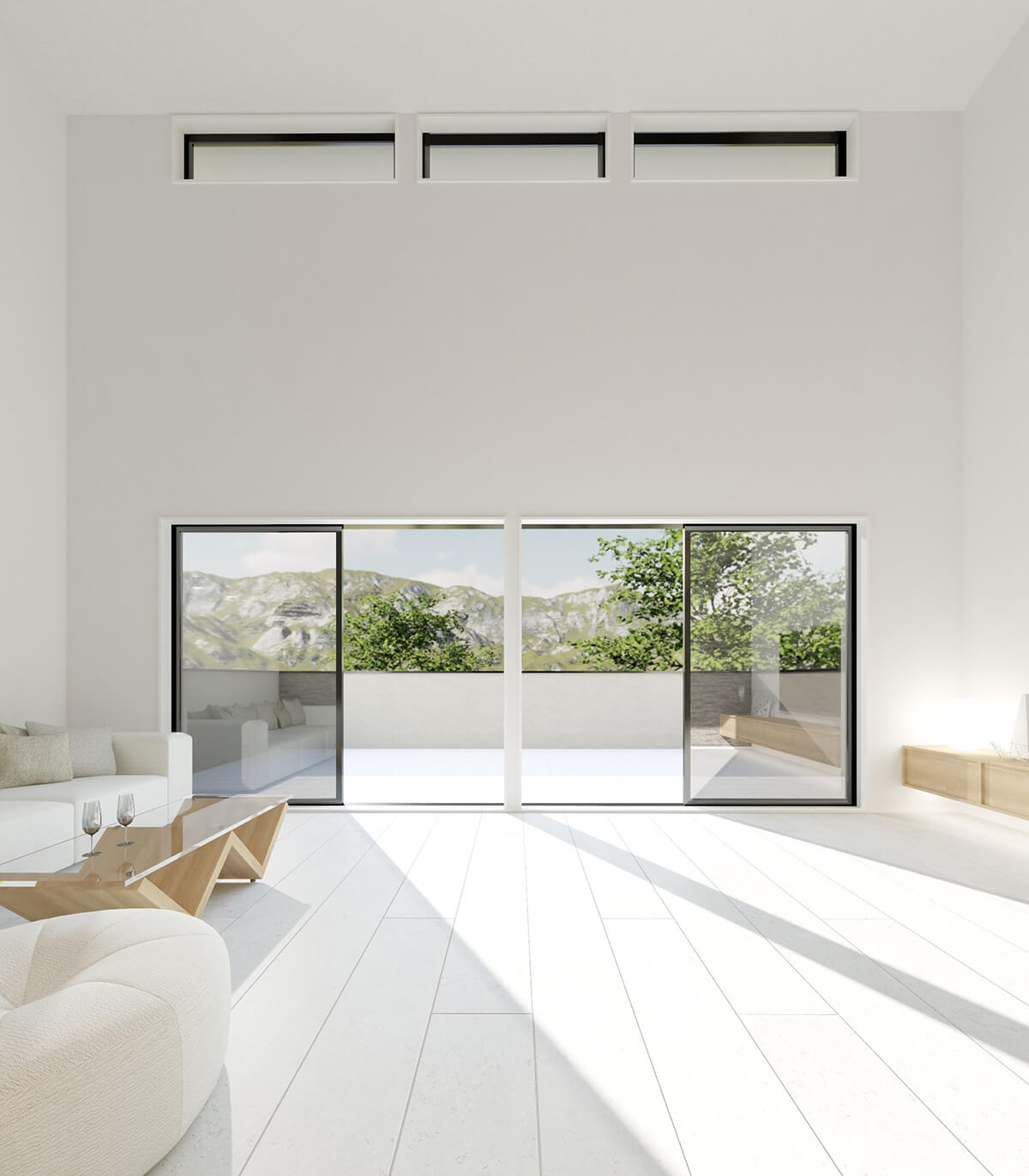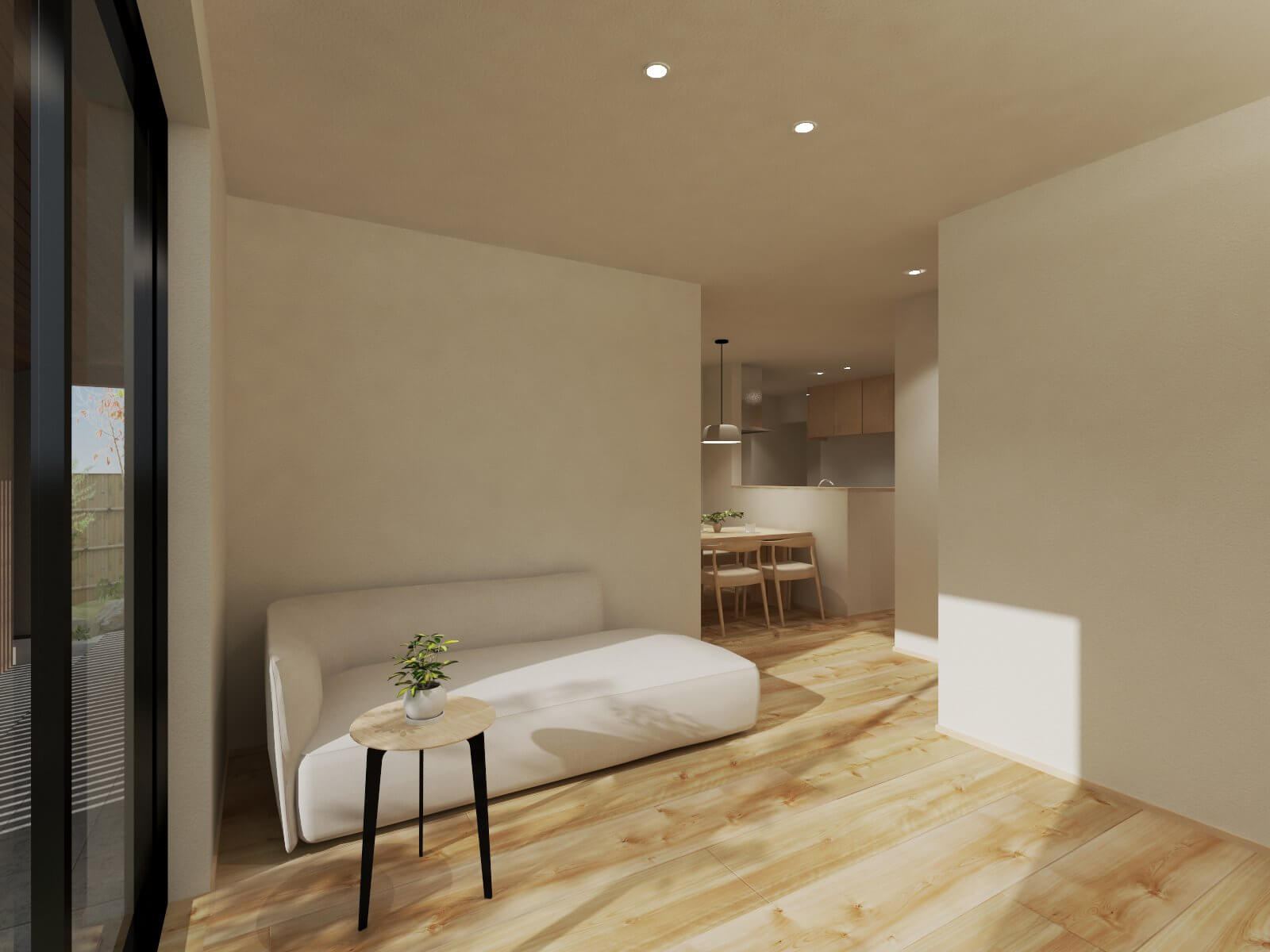 生活の中心となる2階のリビングは、天井を大きな吹き抜けにすることで圧倒的な開放感を生み出しており、南側に設けた大きな窓からは明るい光がたっぷりと差し込みます。