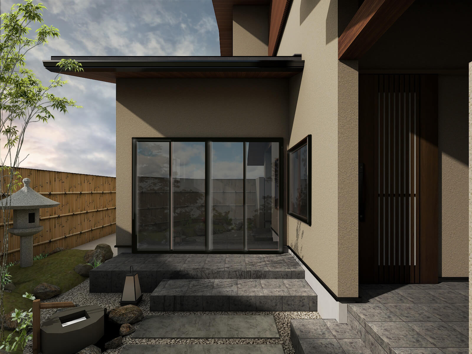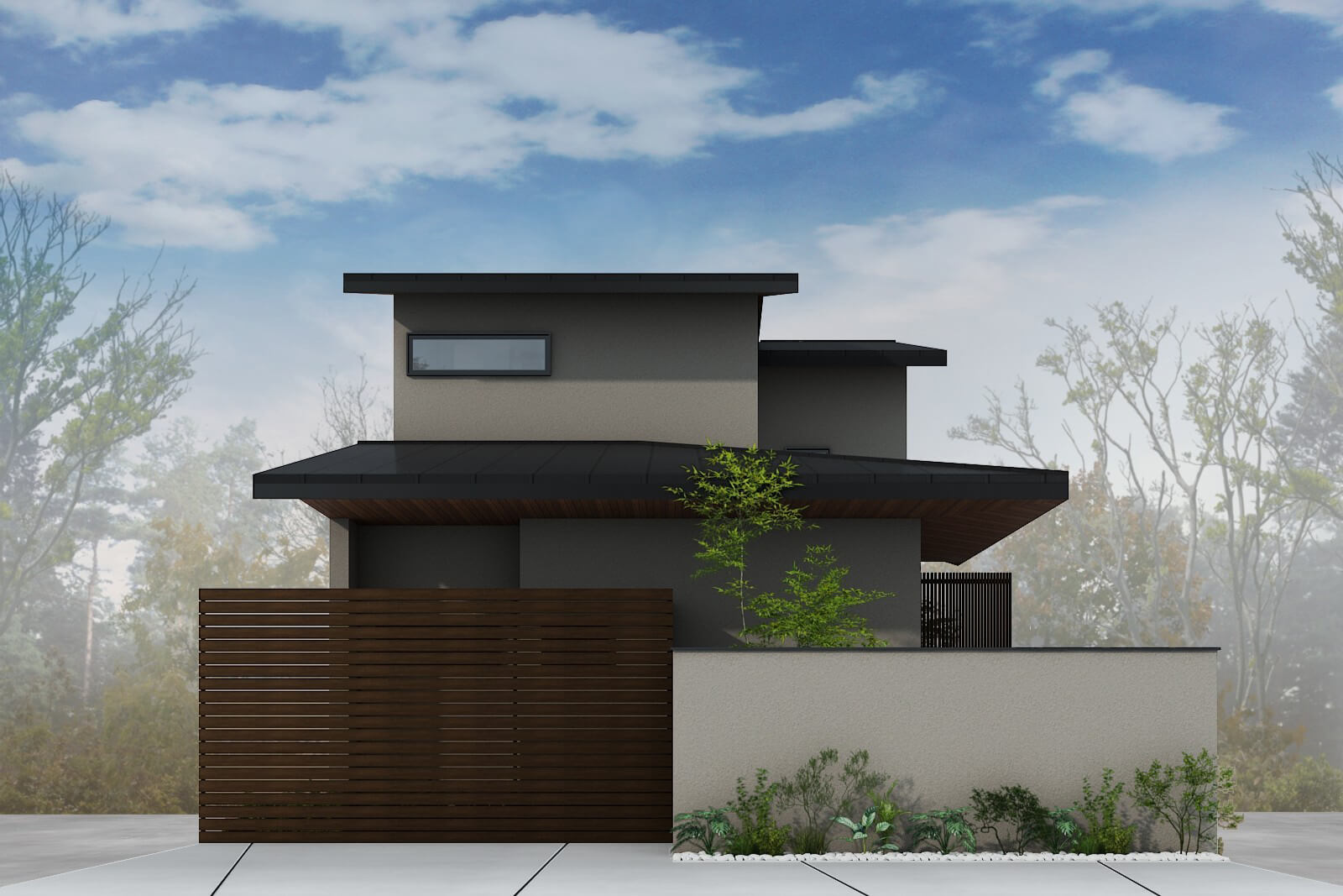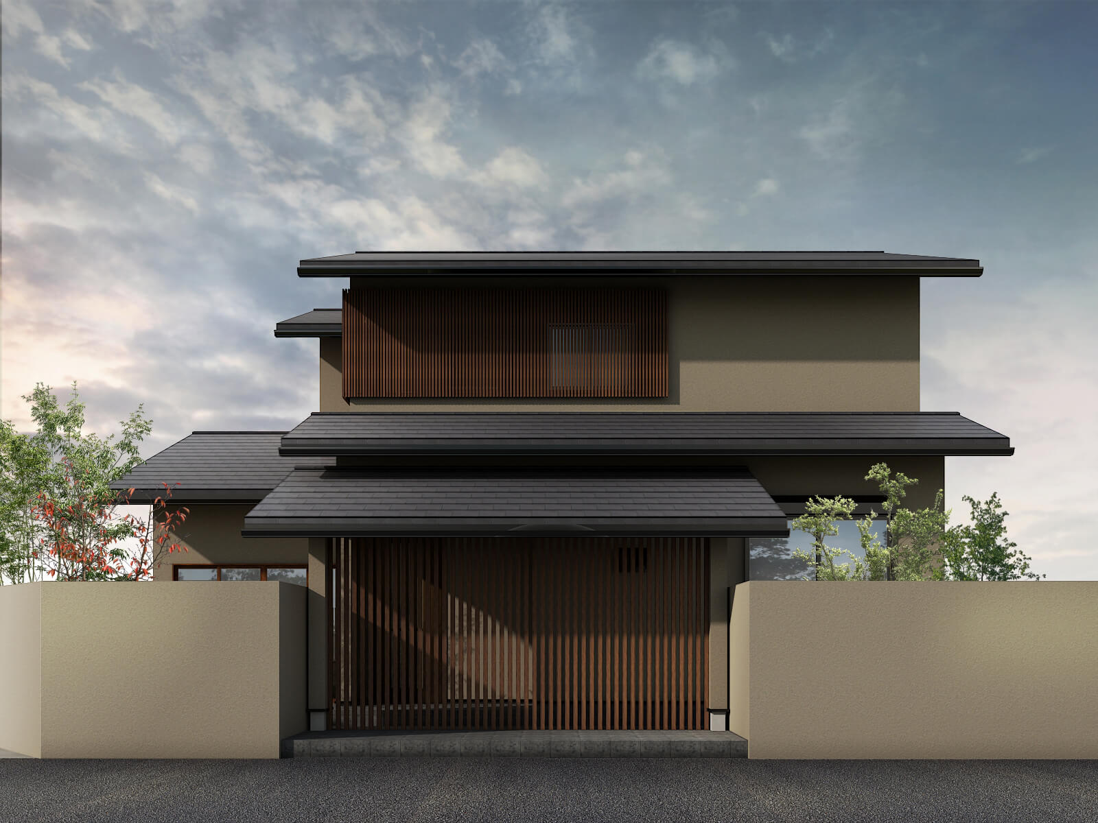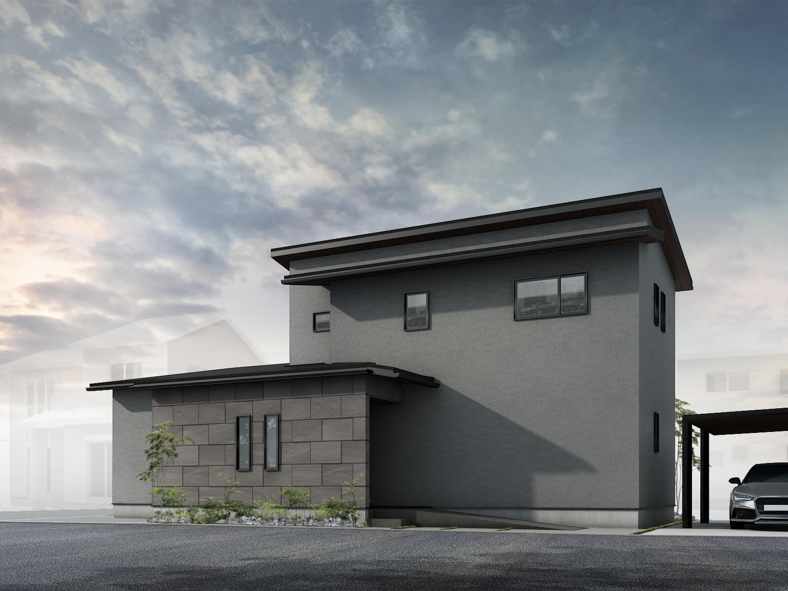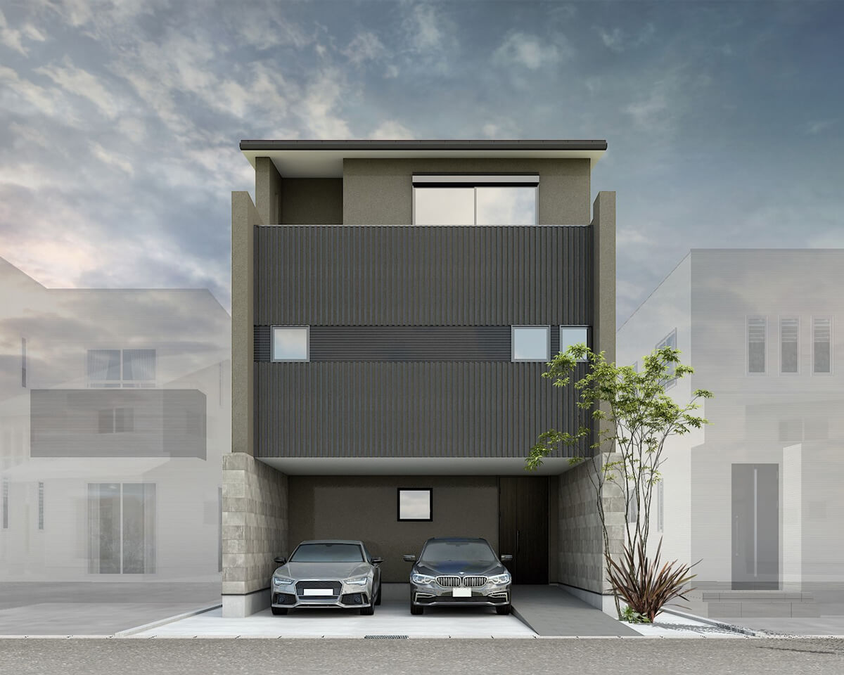 車2台をゆったりと駐車できるビルトインガレージを備えた、3階建ての住まい。将来の生活を見据えて、階段の上り下りが楽になるホームエレベーターを設置しています。