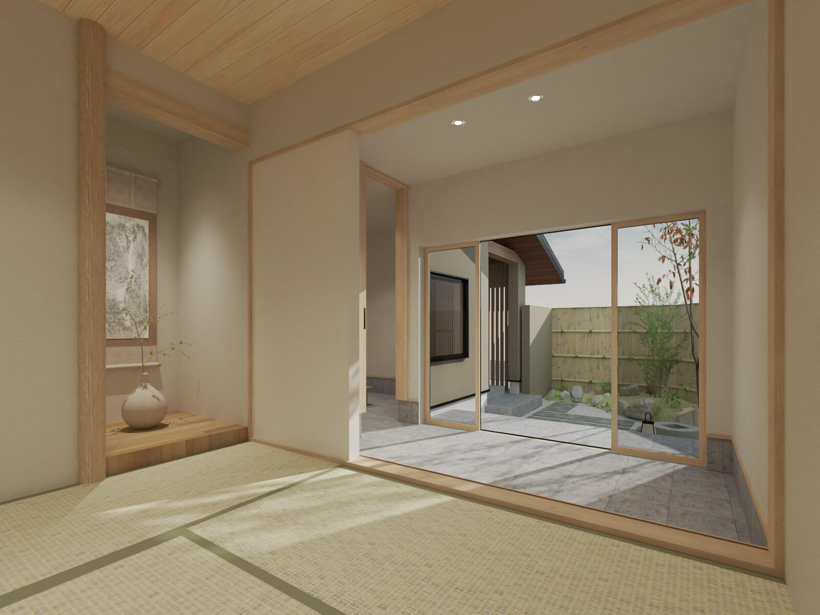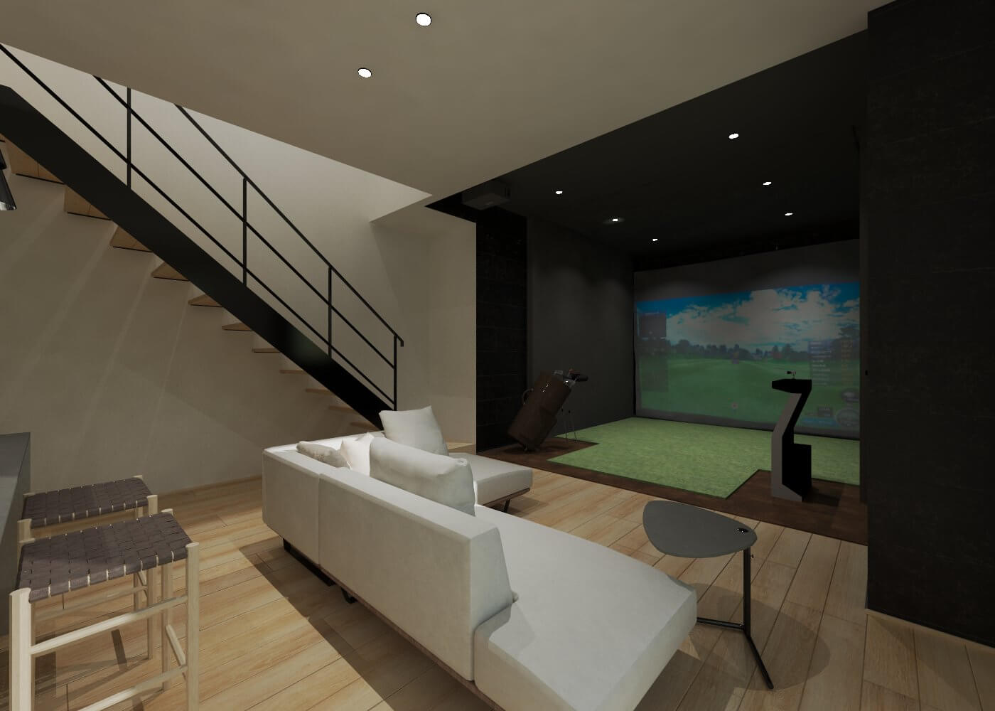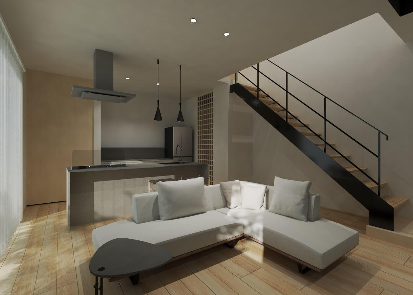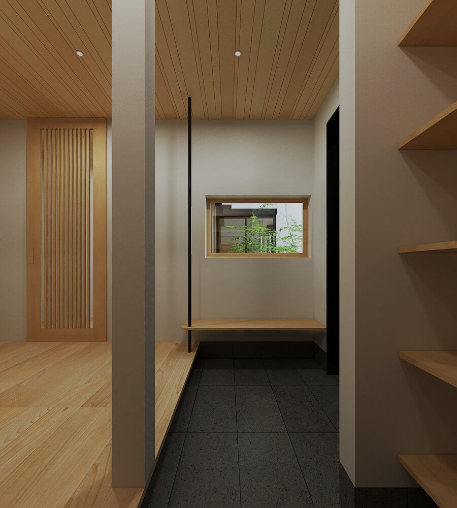 大きな吹き抜けがある、広々とした3階建て