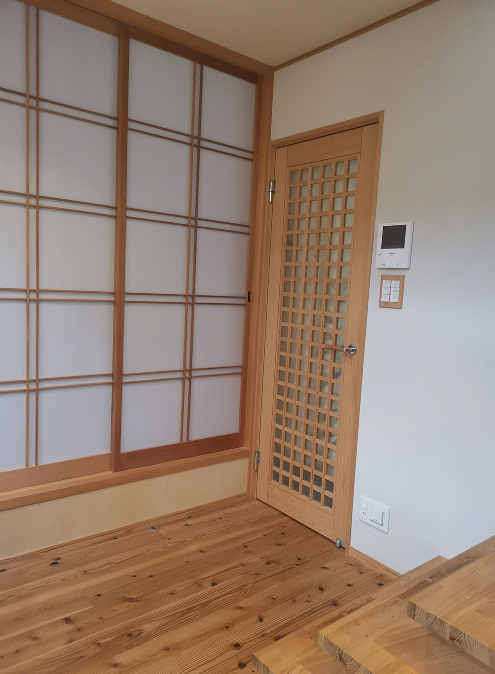映っている井桁格子のドアは桧材(当時写真の階段横の小さい収納扉も)