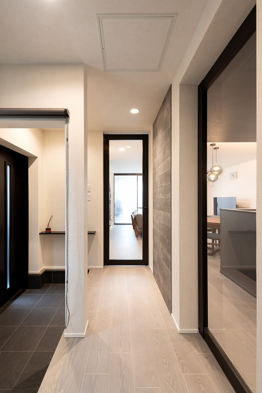 玄関からLDKへとつながる建具にはガラス戸を採用。視線が抜けることで空間に広がりが生まれます。