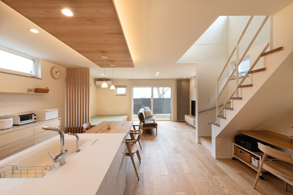 光と視線を整えるため、地窓で緑を取り込みつつ外からの視線は抑える計画にしました。LDKは動線を短くする横並び配置とし、板天井+間接照明で奥行きとリズムを演出。小上がり畳と格子で“こもれる居場所”をつくっています。